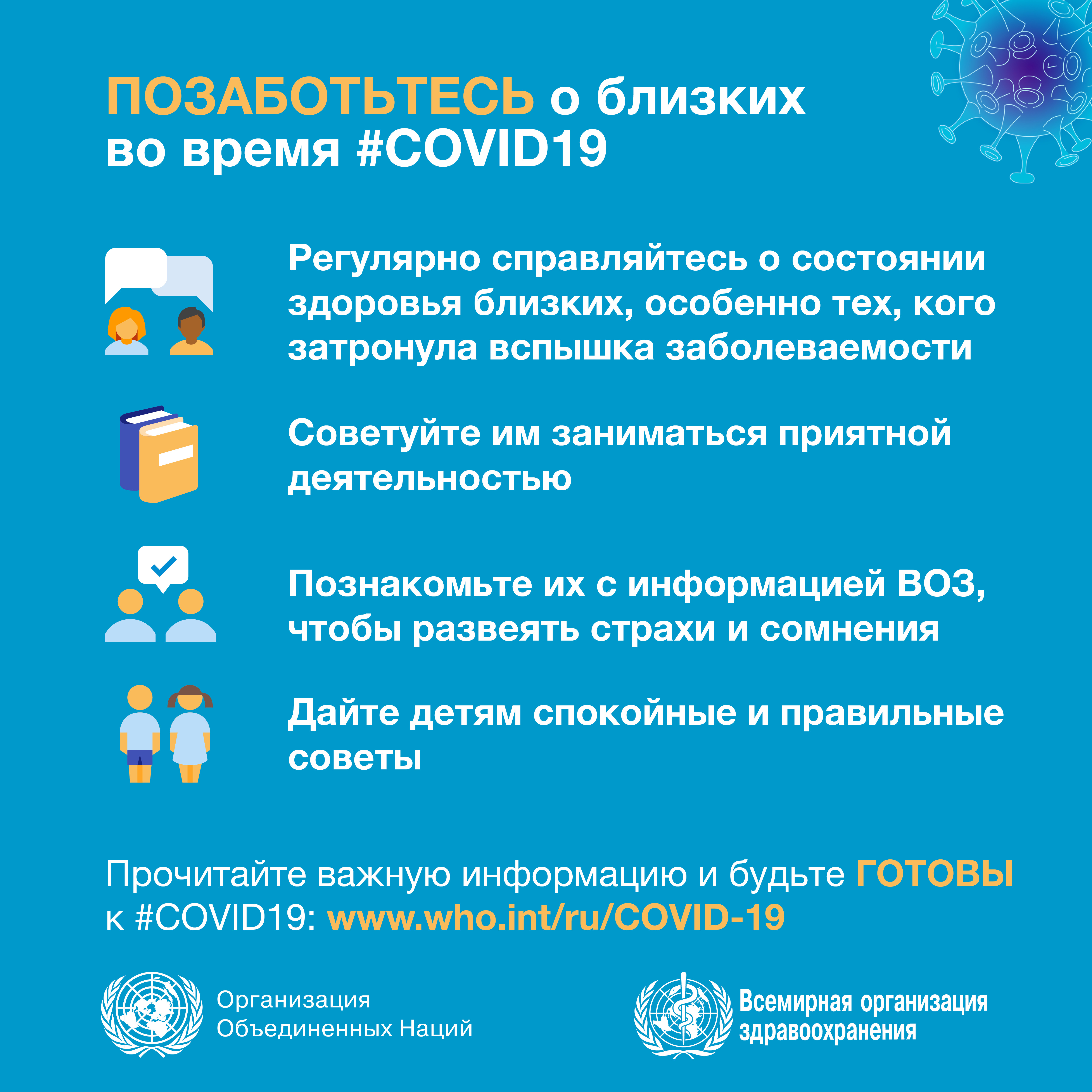 Следите за новейшей информацией о вспышке COVID-19, которую можно найти на веб-сайте ВОЗ, а также получить от органов общественного здравоохранения вашей страны и населенного пункта. Наибольшее число случаев COVID-19 по-прежнему выявлено в Китае, тогда как в других странах отмечаются вспышки локального характера. В большинстве случаев заболевание характеризуется легким течением и заканчивается выздоровлением, хотя встречаются осложнения. Защитить свое здоровье и здоровье окружающих можно, соблюдая следующие правила: